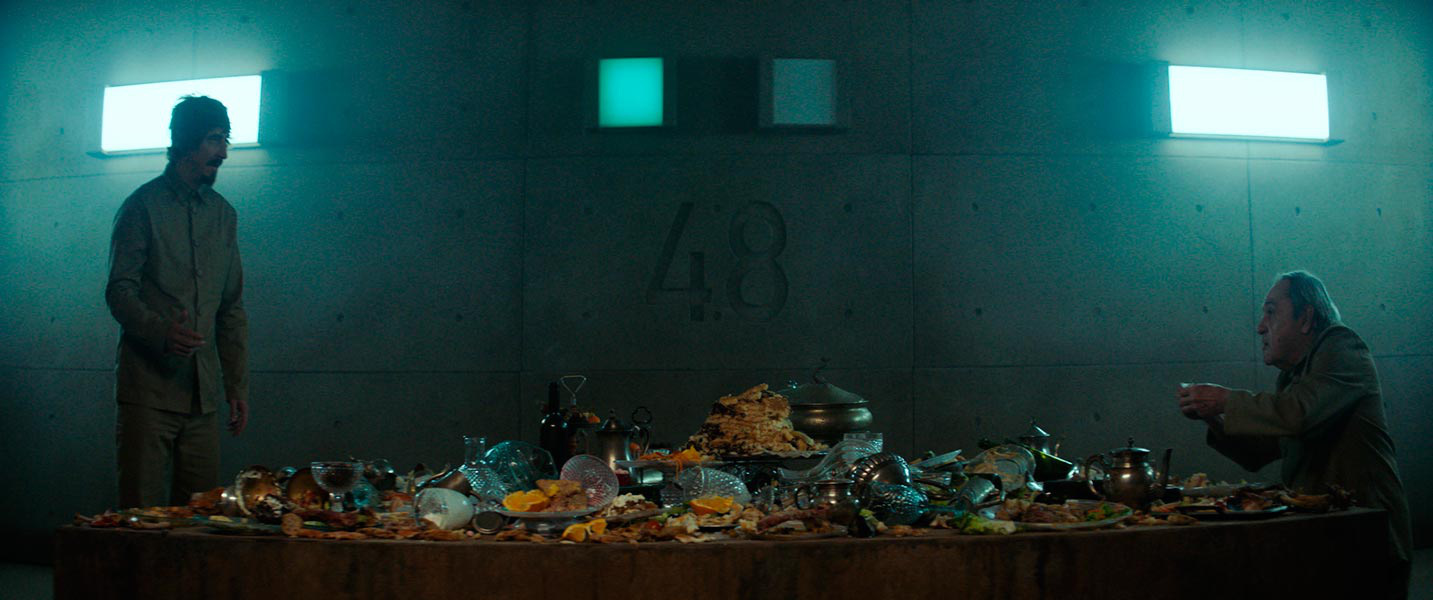 Chiếc bàn ăn trong phim dừng lại mỗi tầng 2 phút, khoảng thời gian ít ỏi chỉ để người tù ngấu nghiến những thứ gì còn lại trên bàn thay vì đắn đo nên để lại bao nhiêu cho kẻ bên dưới.
